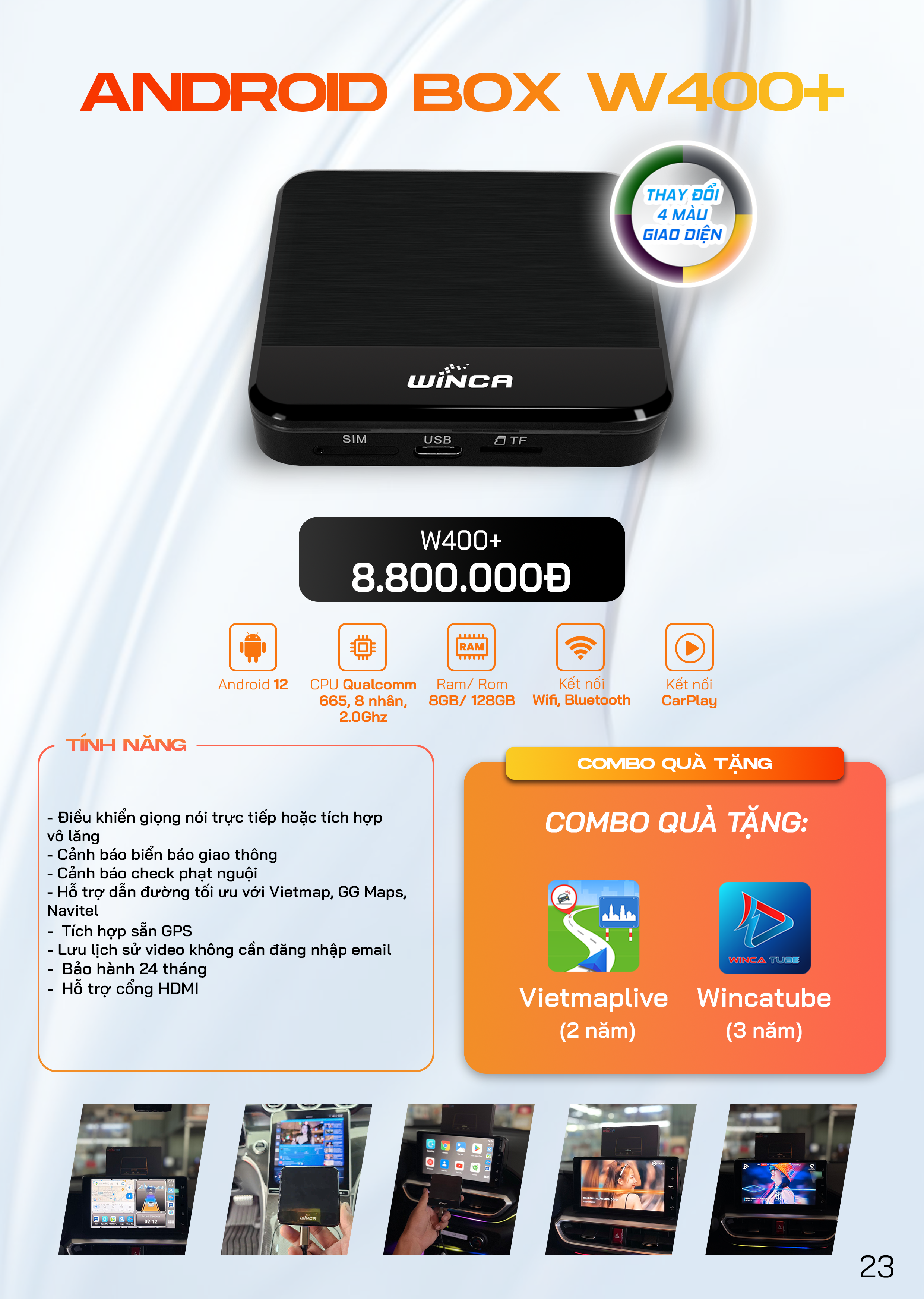 - Winca Android Box W400+ là thiết bị ngoại vi được kết nối với màn hình zin thông qua cáp USB
